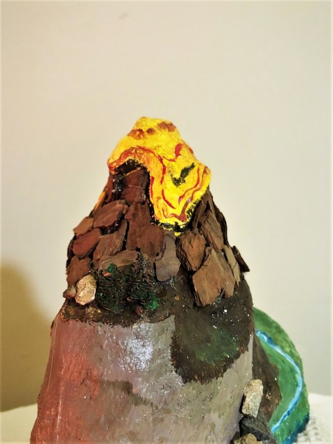 I let the shape of the plastered shoe tell me where it wanted to go. The paint was based on relative figures that seemed to fit the crevices or protrusions. The lava was based on the same, built out of paper underneath the plaster. The water cradled in an indentation of the shoe. The river following where the sole began. The trees standing where they could be stood. I tried to let it be as natural as possible, because that’s what it’s like to live with someone who loves you, but more importantly, knows you.