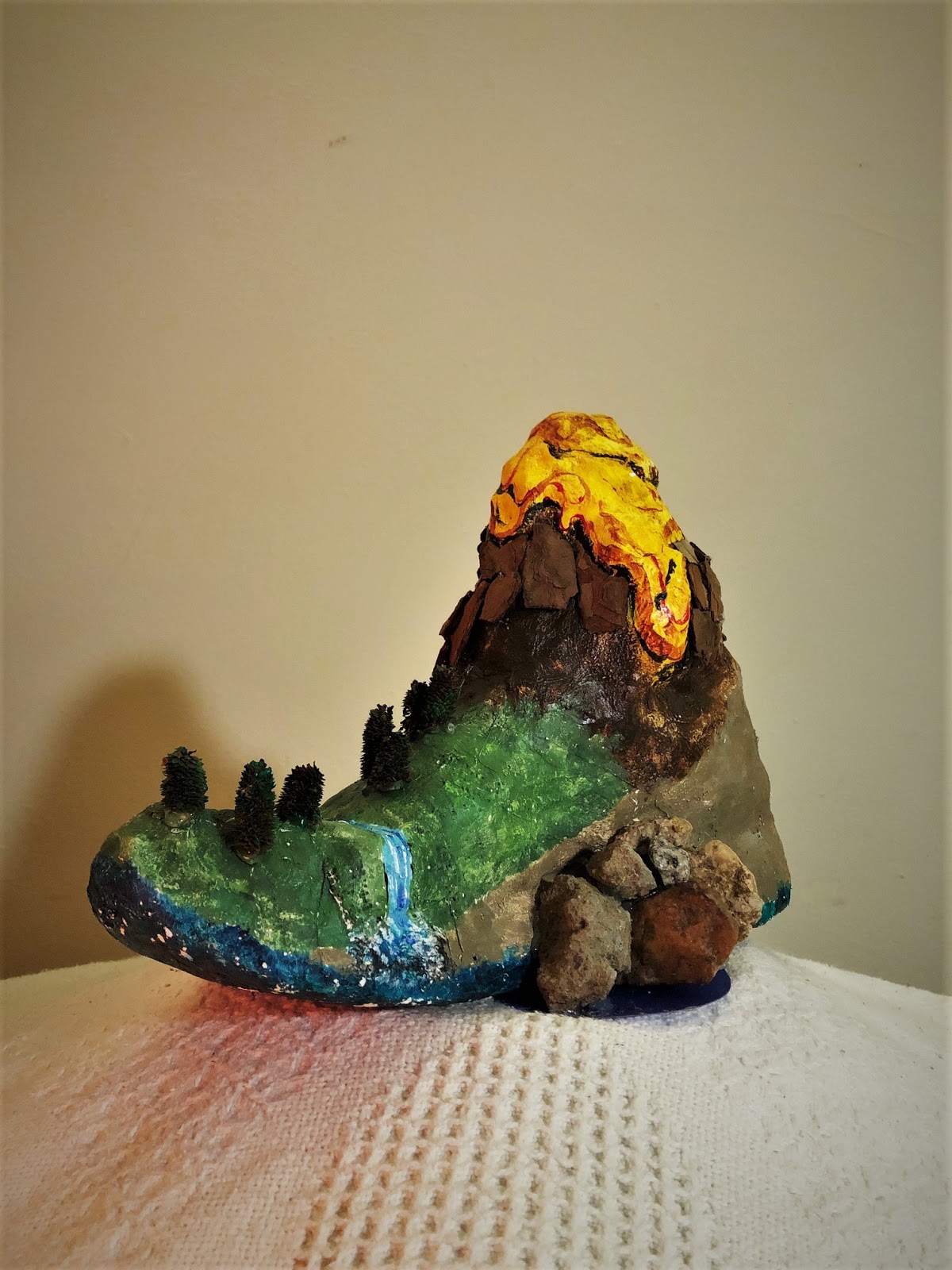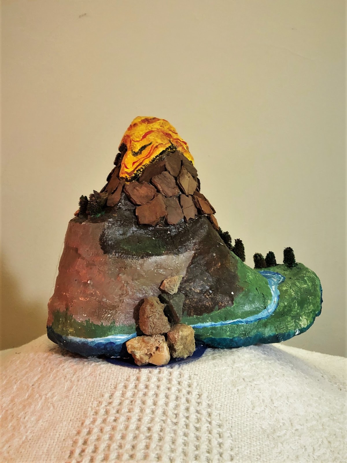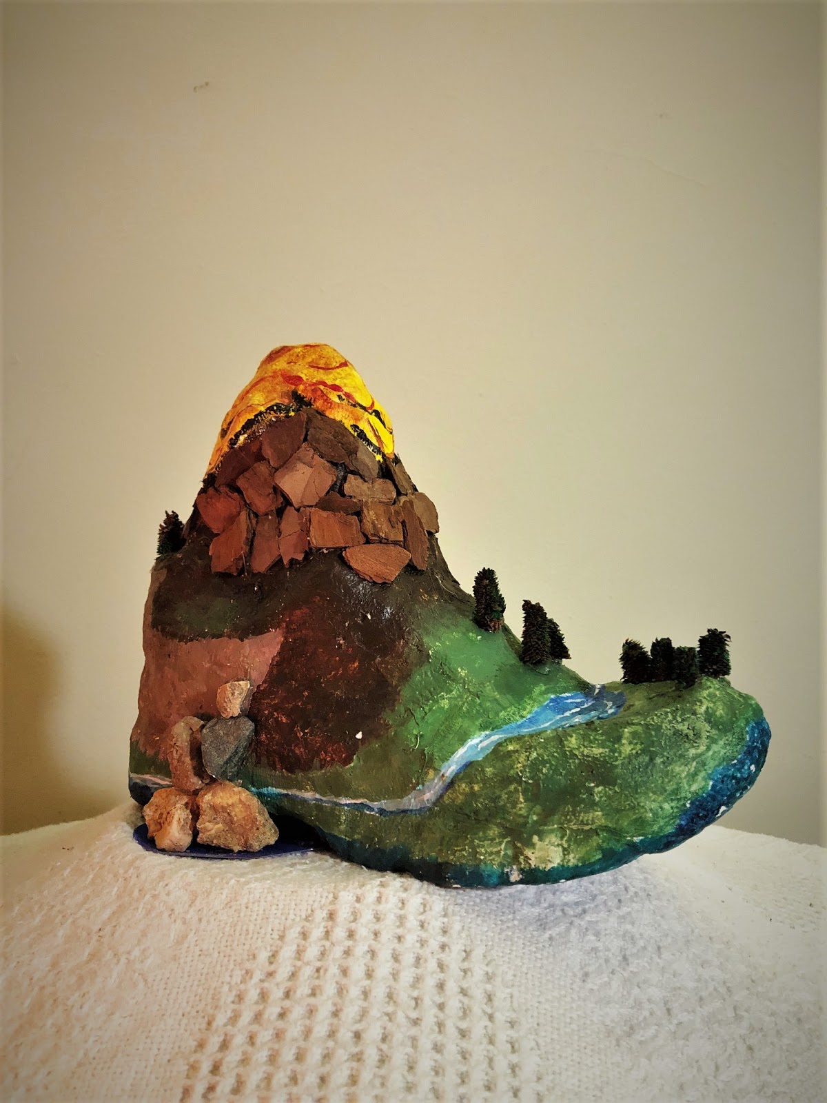 I let the shape of the plastered shoe tell me where it wanted to go. The paint was based on relative figures that seemed to fit the crevices or protrusions. The lava was based on the same, built out of paper underneath the plaster. The water cradled in an indentation of the shoe. The river following where the sole began. The trees standing where they could be stood. I tried to let it be as natural as possible, because that’s what it’s like to live with someone who loves you, but more importantly, knows you.