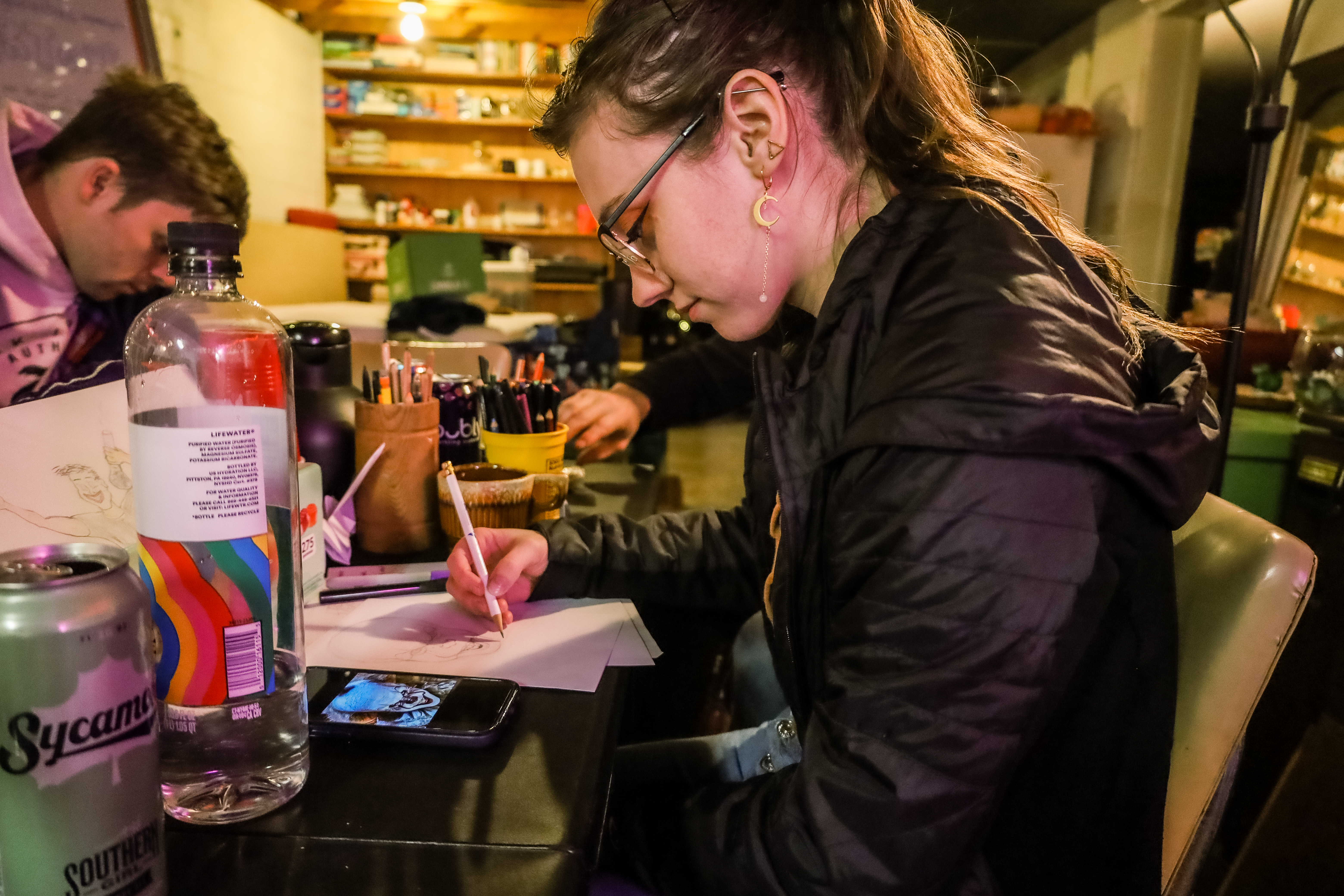 A hard-working designer, Mackenzie utilized her time at the Art Club to flip flop between a pristine It drawing and some logo designs for her freelance work. She also researched some Imbolc-related runes to later wood-burn into a beaded bracelet. In other words, there’s no denying she was the most productive one of us all!
