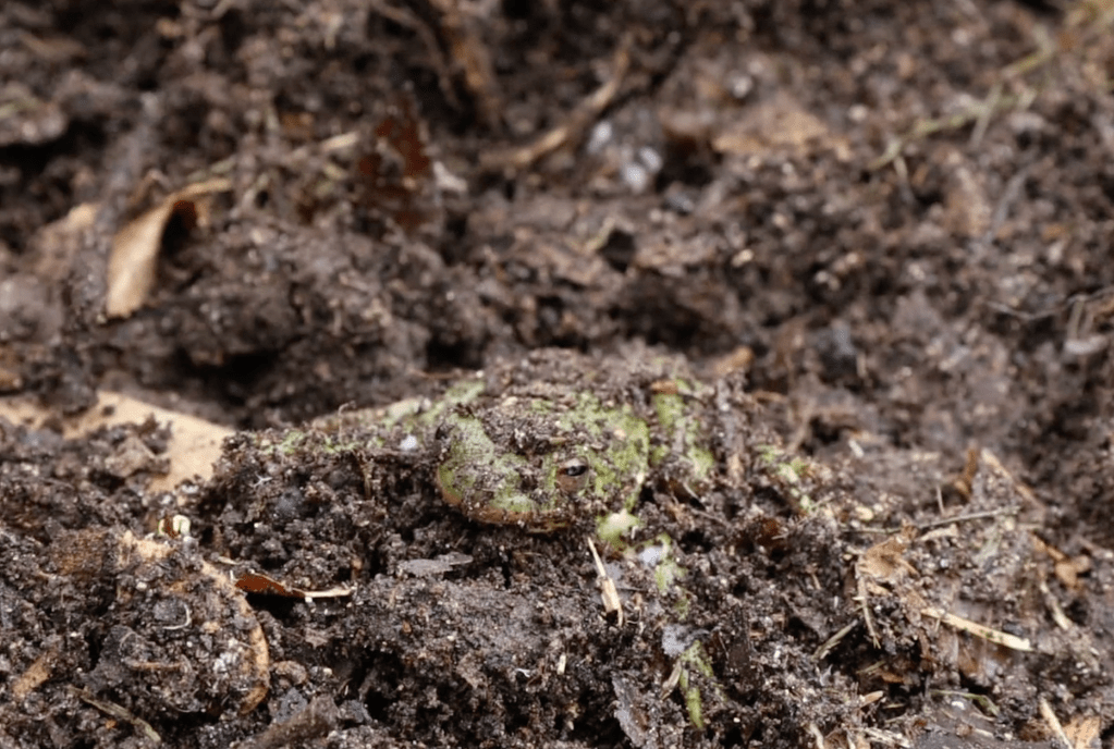 The Spring Peepers at the swamp are a boisterous bunch in the summertime. When it’s rainy and hot, we await the arrival of the peepin’ as the sun goes down and watch the fireflies seemingly dance to the sound. The other day when we were filling the garden beds with our massive compost pile, we accidentally upturned a hibernating spring peeper. We felt bad that we scared him, and tried placing him back in the compost pile. Video to come soon, here he is below: