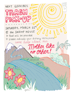 Our third Trash Pick Up will be on March 11th, two weeks before the Spring fest. We try to space out events every two weeks, always on Saturdays, to give our regulars a break from having to deal with the Pete-and-Drea-overly-enthusiastic energies. Anyways, here’s the flyer 🙂
