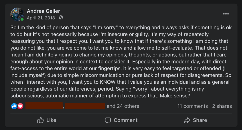 As my Facebook post from five years ago expresses, I say sorry as a compulsive way to show consideration. I say sorry to express empathy and sympathy. I say sorry’s instead of excuse-me’s, don’t-mind-me’s, oop’sies, didn’t-hear-youzies, bumped-into-thee’s. I say sorry sarcastically, especially when I’m suffering the same sufferings as the other person – like when we’re both standing in the sun and the companion in question dares to complain that it’s hot. Like, I feel you, bro.