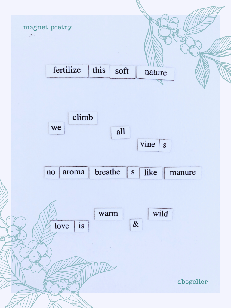 The beauty of magnet poetry is that the combination of the words provided for you generates its own meanings. With these, I closed my eyes and felt along the magnets and picked a handful until I felt I could garner a direction from them. The random words I “drew,” so to speak, were fertilize, vine, manure, and wild.