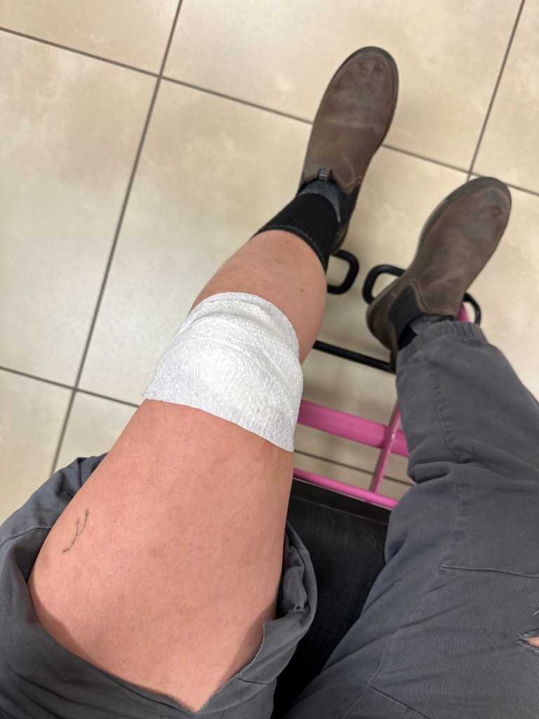 Yep. Self-explanatory. Accidentally hit my knee with a fiber disk grinder at work. Thankful for my coworkers, my mom, my partner, and all my friends and family who make up my village and have made this tragic accident not a complete disaster in my life. I am very lucky. Thank you thank you thank you.