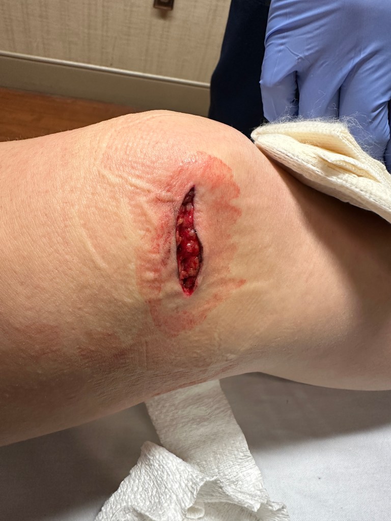 I am also very lucky that this injury happened where it did. Had it been an eighth of an inch to the front of my knee, it would’ve hit my patella. A quarter of an inch the other way, would’ve cut a ligament. Less than half an inch of clearance total for this gaping slice to have immobilized my precious left knee.