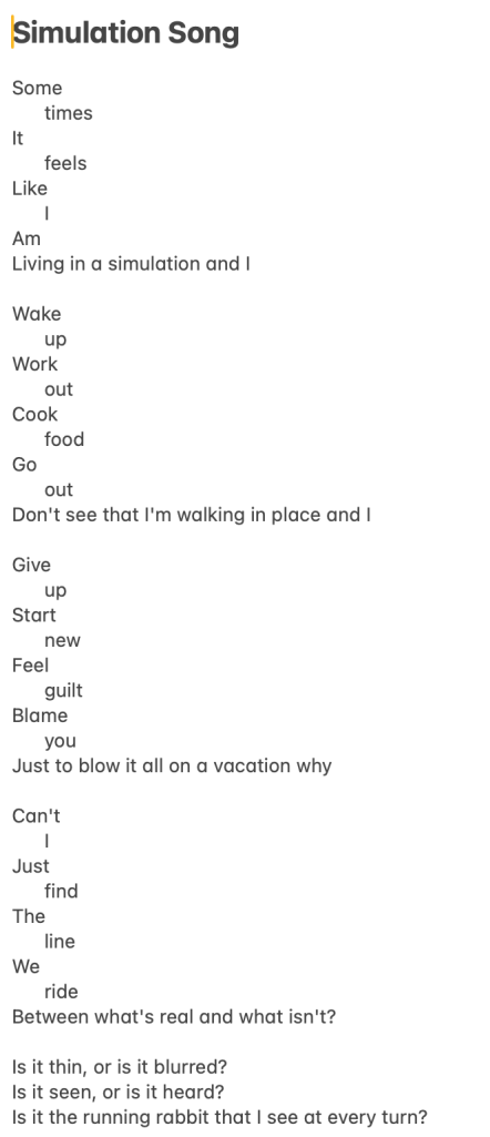 I’m thinking of calling it “Hamster Wheel” instead of “The Simulation Song” because of the joke my coworkers made about our brains. One of them said that there’s only one hamster on his wheel, and it’s taking a nap. The other said their hamster just gains existential consciousness intermittently, causing them to zone out and completely forget what they were doing. I said I had two hamsters, and one is desperately trying to run the wheel while the other is napping. I told Pete that both his hamsters are trying to do exercises on the wheel in such a way that the wheel is not meant for. Wish I had a sketch of each of these ideas.