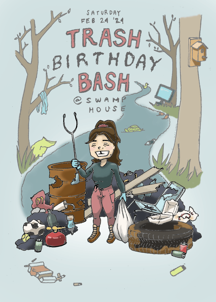 So here’s the little flyer. We’ll have people come over during the day, provide some grub, go out into the swamp to pick up some trash, and then play board games in the evening and maybe light up a Christmas tree late at night. Friends with kids have been invited for the daytime activities.